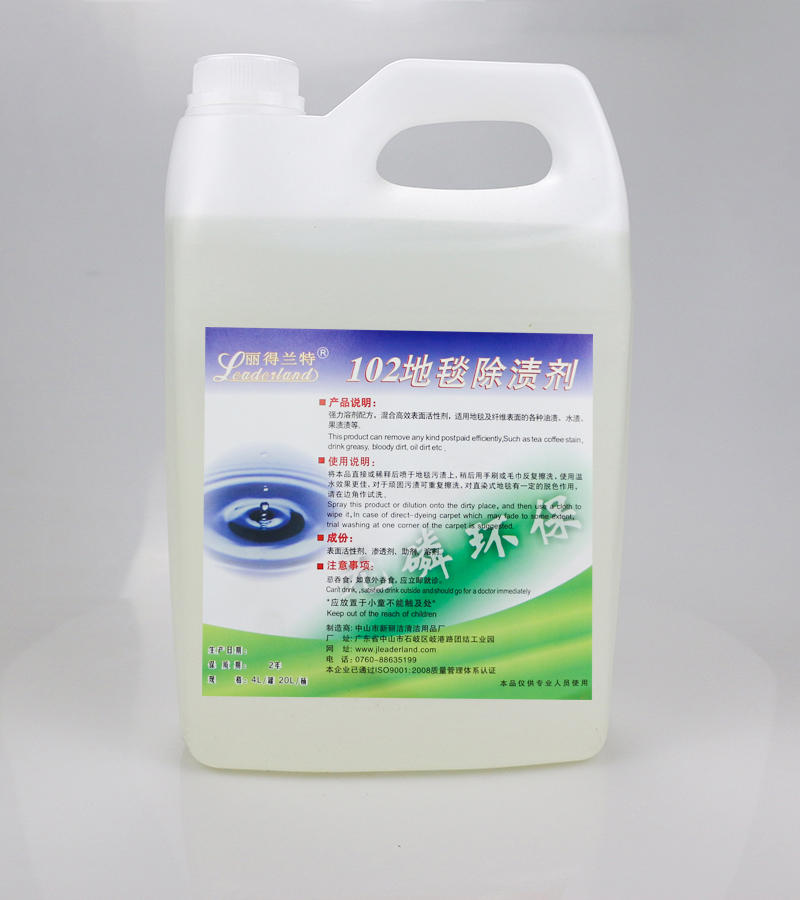 本品能除去地毯上的蛋白質(zhì)或水溶性的污漬,如:血,奶,巧克力,冰淇淋等污漬,氣味清新,將本品原液或稀釋滴灑在污垢上,用刷子擦洗或擦機(jī)清洗。大面積處理請(qǐng)用噴壺均勻噴灑在地毯上,然后用于干泡地毯水或低泡地毯水清潔均可。